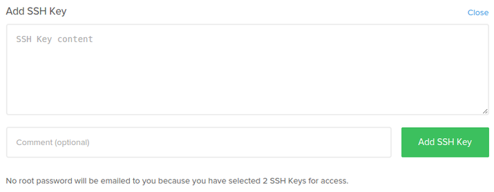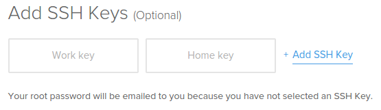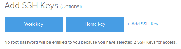 If you have already added a public key file to your DigitalOcean account, you will see it here as a selectable option (there are two existing keys in the example above: "Work key" and "Home key"). To embed an existing key, simply click on it and it will highlight. You can embed multiple keys on a single server: