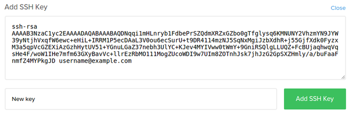 If you do not already have a public SSH key uploaded to your account, or if you would like to add a new key to your account, click on the "+ Add SSH Key" button. This will expand to a prompt:
