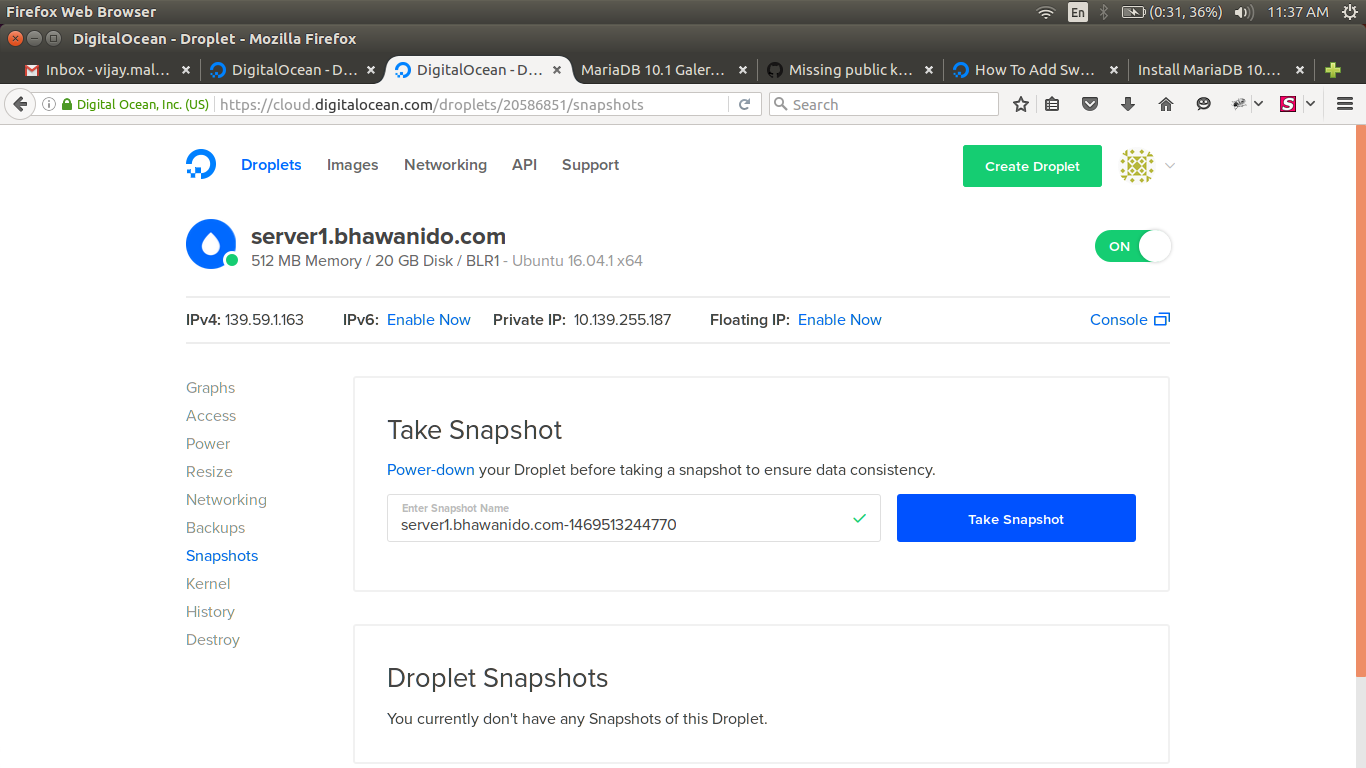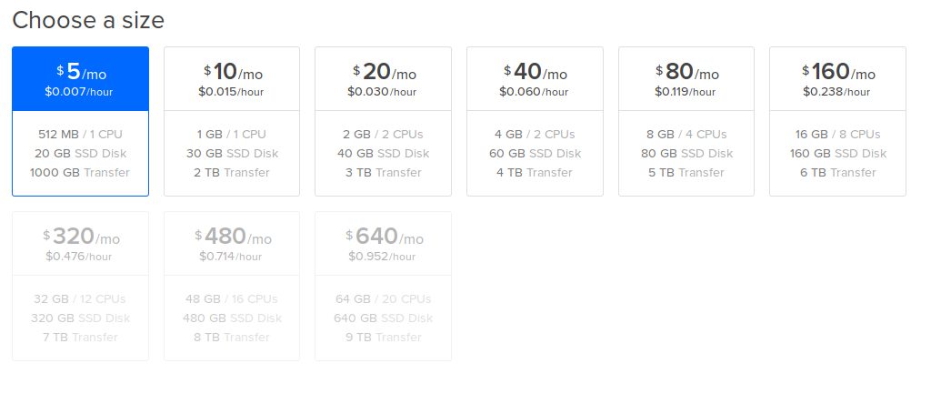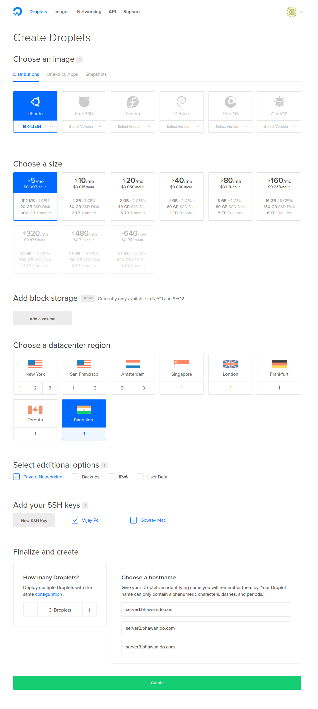 In this guide, we will be creating droplets based on the Ubuntu 16.04 LTS x64 image. We will also be using DigitalOcean’s snapshots services to reduce the amount of installations we will need to run during our cluster node deployments.